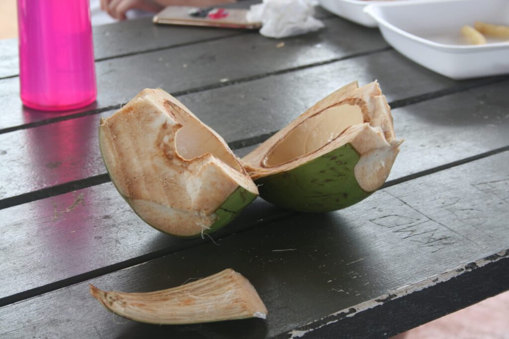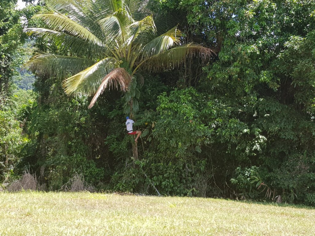 Auf dem Weg zu unserem nächsten Stop durchtrieb Terry der Jagdinstinkt. Kurzerhand stoppte er den Bus am Straßenrand und verkündete, dass er einen Kokosnussbaum entdeckt hatte und uns nun Mittagessen besorgen würde. Ohne weitere Erklärung griff er sein großes Messer und lief auf den fünf Meter hohen Baum zu. Wir konnten unseren Augen kaum glauben, als er tatsächlich die Palme wie ein Affe hochkletterte und eine Kokosnuss vom Baum schlug! Ab diesem Moment war uns klar, dass Terry mit ganzem Herzen im Regenwald zuhause ist…