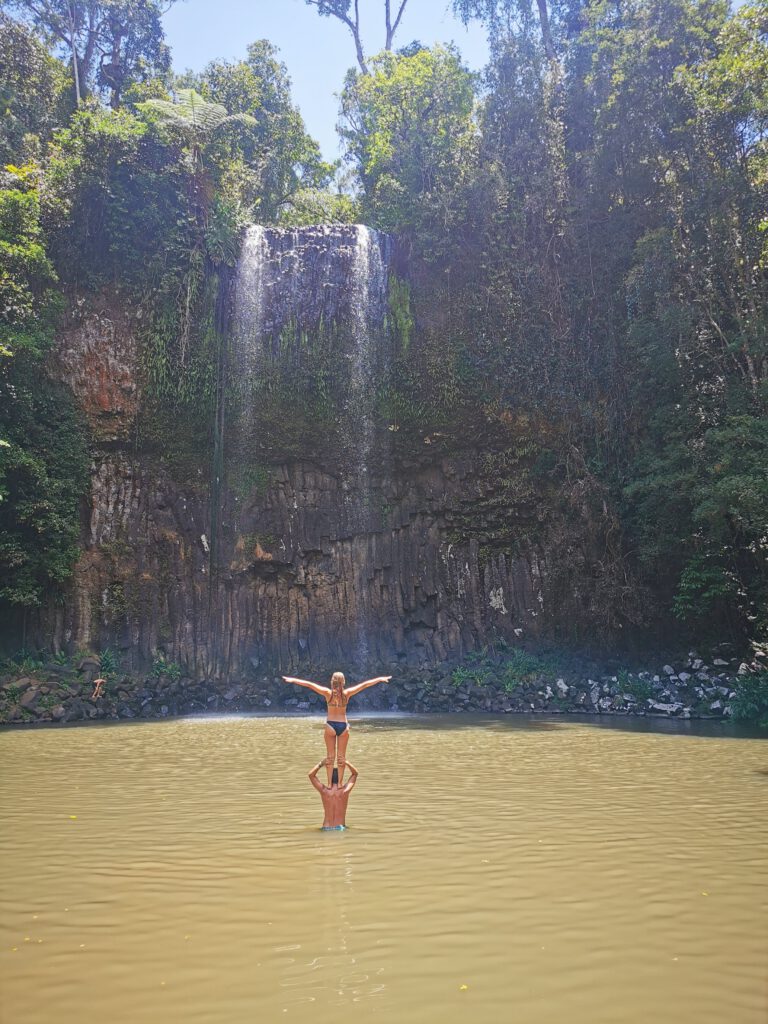 Außerdem konnte man hinter den Wasserfall schwimmen und ihn von hinten beobachten. Zum Abschluss durften wir von Terry’s Schultern ins Wasserbecken springen!