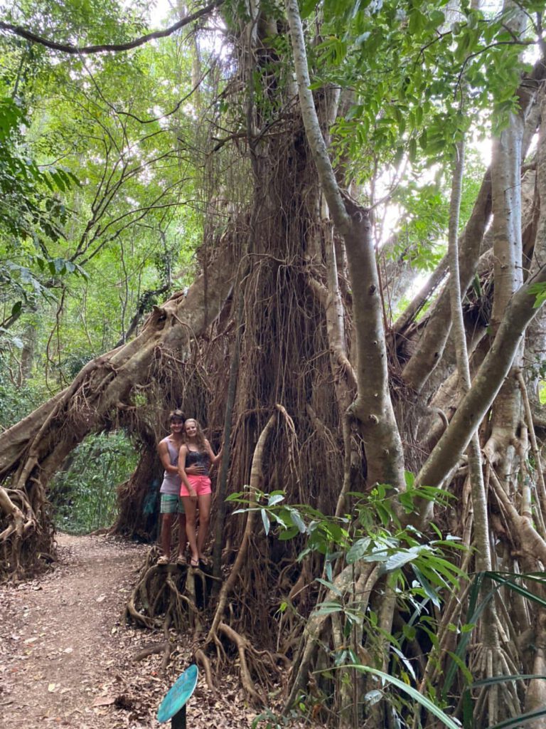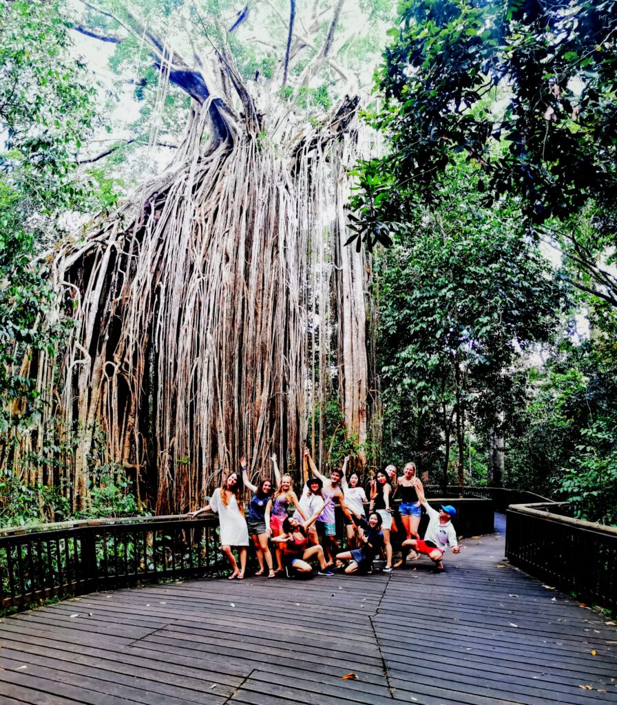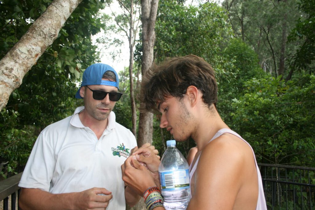 Auf einem kleinen Regenwald-Weg dorthin informierte uns Terry über Tiere und Pflanzen und stellte uns jede noch so kleine Ranke persönlich vor – allerdings erzählte er so amüsant, dass es niemals langweilig wurde. Vor allem demonstrierte er uns alles vor Ort: Wie stark eine Ranke mit Widerhaken war, zeigte er uns, indem er barfuß hindurchlief und die Pflanze dabei fast sein T-Shirt zerriss. Dabei trat er aus Versehen auf die Pflanze drauf – doch als wir schon bildlich den Krankenwagen vor Augen hatten, war für Terry „Everthing allrighty“!