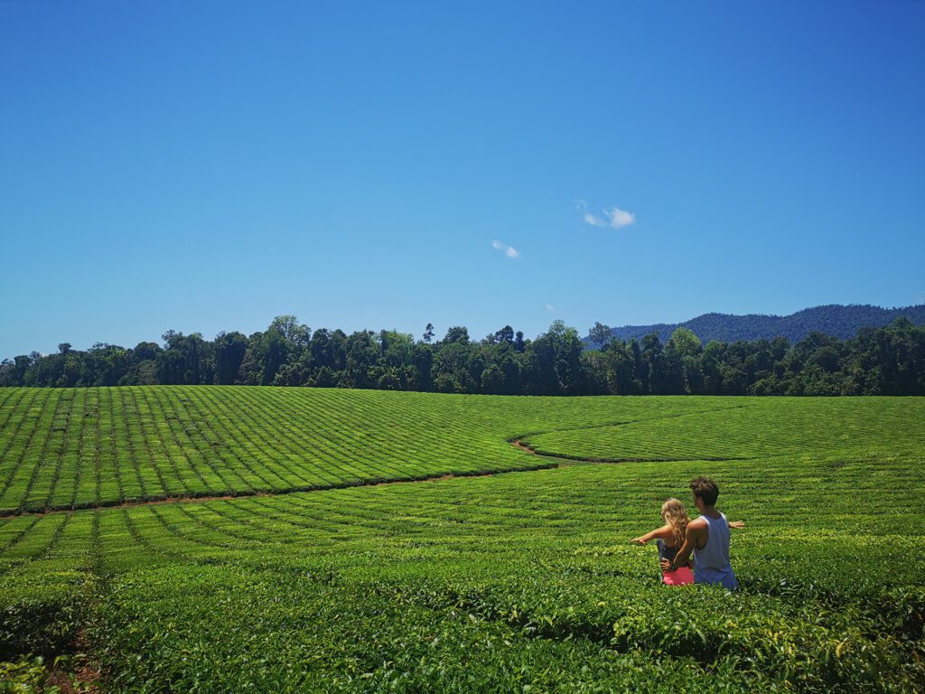 Auf dem Weg zum letzten Highlight im Regenwald machten wir noch einen kurzen Halt an einem Tee-Feld. Dort konnte man frischen Tee kaufen und vor allem, wie Terry sagte, „romantische Bilder schießen“…