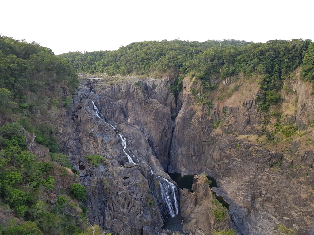 Der letzte Wasserfall der Tour wurde „Barron Falls“ genannt. Beim Beobachten des beeindruckend großen Wasserfalls lehrte uns Terry eine weitere Lektion des Regenwalds: Man kann den grünen Po von heimischen Ameisen essen. Natürlich brauchte er ein Opfer, das demonstrierte, dass man von solch einer Ameise nicht starb. Und dafür wählte er ausgerechnet Lars!