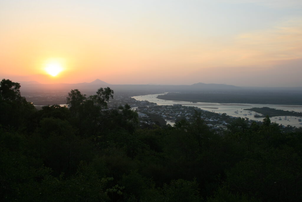 Am frühen Abend nahmen wir am vom Hostel organisierten „Sunset-Walk“ teil. Ein smarter Engländer lief mit uns zu einem wunderschönen Lookout mit tollem Blick auf ganz Noosa und den Sonnenuntergang. Zu der Atmosphäre passend, hatte unser Reiseleiter einen Beutel „Goon“ (eine Art sehr billiger Wein) dabei, mit dem wir feierlich anstießen. So nahm die Party ihren Lauf…